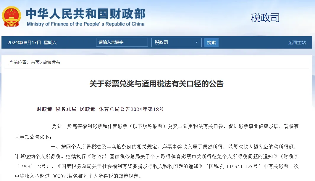 一、按照个人所得税法及其实施条例的相关规定,彩票中奖收入属于偶然所得,以每次收入额为应纳税所得额,计算缴纳个人所得税。继续执行《财政部 国家税务总局关于个人取得体育彩票中奖所得征免个人所得税问题的通知》(财税字〔1998〕12号)、《国家税务总局关于社会福利有奖募捐发行收入税收问题的通知》(国税发〔1994〕127号)中有关彩票一次中奖收入不超过10000元暂免征收个人所得税的政策规定。