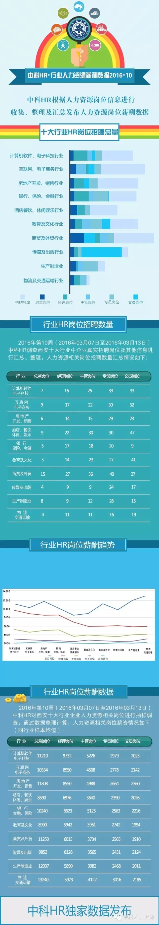 2016年第10周,中科HR调查组就西安地区10大行业:计算机软件电子科技行业,互联网电子商务行业、房地产开发销售行业、银行保险金融行业、酒店餐饮休闲娱乐行业、教育及文化行业、商贸及外贸行业、出版及传媒行业、生产制造业、物流及交通运输行业,各级别人力资源岗位现状进行了详细调查